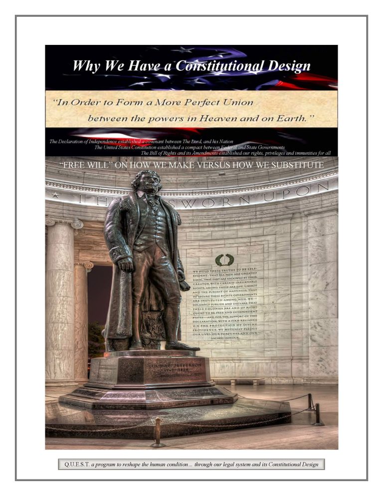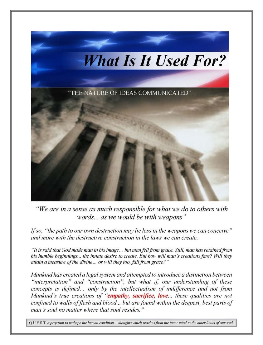 One aspect of [Q.U.E.S.T.] and its mission is to reshape the human condition through Controlling Legal Principles [CLP] with the prospective relief in a right to exist as ‘I Am’ versus a personal stake as defined, designed, driven, devalued, degraded, deprived, or fearful to be destroyed by law respecting an establishment of religion in a matrix of religious dealings.